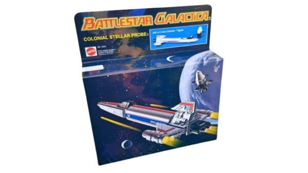Introducing the Mattel Colonial Stellar Probe Reproduction Box from Battlestar Galactica reproduction box, a nostalgic tribute to the classic sci-fi series.